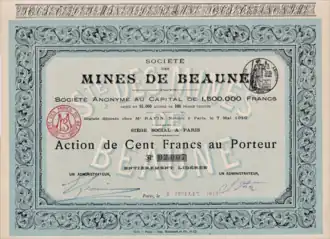 La concession relative à l'exploitation moderne des mines de Beaune démarre dans la foulée de prospections réalisées par Auguste Rodocanachi à partir de 1908. Le Préfet avait autorisé le démarrage des recherches[2]. Plusieurs puits de recherche sont creusés sur l'emplacement de certaines aurières gauloises.