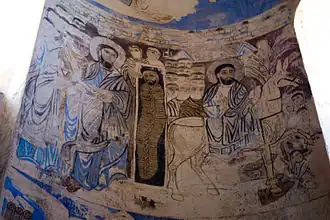 L'évangéliaire d'Etchmiadzin (Matenadaran, Ms. 2374[16]) est un des autres exemples fameux de ces premiers manuscrits. Réalisé en 989 au monastère de Bgheno-Noravank, ce somptueux ouvrage est doté d'une reliure byzantine en ivoire (seconde moitié du VIe siècle[17]) et incorpore quatre miniatures en pleine page, regroupées sur deux feuillets, des VIe et VIIe siècles[17], au style proche des fresques du VIIe siècle mais traduisant une influence sassanide, avec les tenues et les coiffures des rois mages[18], par exemple[19],[12] ; ces quatre miniatures au caractère monumental dans le traitement des personnages, dotés de grands yeux et aux visages au modelé librement brossé, dont le décor architectural rappelle les édifices paléochrétiens, s'inscrivent dans la tradition picturale paléochrétienne[19] et constituent ainsi une persistance du répertoire antique[5]. D'autres miniatures des XIe et XIIe siècles ornent ce manuscrit, notamment des miniatures liminaires illustrant les thèmes majeurs du salut et les quatre Évangélistes, et sont d'un style moins antiquisant que celles de l'Évangile de la reine Mlké[11], tout en faisant preuve de fraîcheur et de sensibilité et en adoptant des fonds neutres[20]. « Exemple exceptionnel de l'épanouissement de la peinture qui s'observe au lendemain de la domination arabe »[11], il représente avec l'Évangile de la reine Mlké « la plus haute expression d'un courant classique antiquisant qui traverse aux IXe et Xe siècles la peinture en Arménie, parfaitement distinct du courant plus abstrait et décoratif qui la caractérise aussi pourtant à la même époque, représenté notamment par l'Évangile de Baltimore »[20].