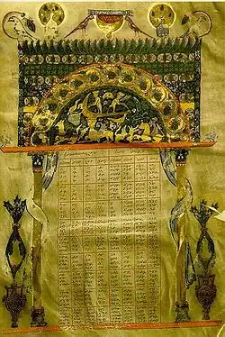 L'enlumineur officie après le copiste (sauf pour les tables des canons) ; il débute par « le décor non figuratif, frontispices, lettres ornementales, décors marginaux, pour finir par les miniatures » proprement dites[116].