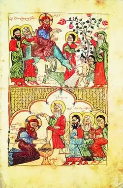 L'influence de la miniature de l'école du Vaspourakan va au-delà des territoires limitrophes. En effet, l'école d'enluminure du Nakhitchevan lui est étroitement liée[69]. Deux manuscrits illustrés permettent de définir les particularités du style propre à l'école du Nakhitchevan : le premier est un Évangile (Matenadaran, Ms. 3722) copié en 1304 par l'artiste Siméon et un autre Évangile (Matenadaran, Ms. 2930) transcrit en 1315 par un nommé Margaré, lui aussi miniaturiste et calligraphe.