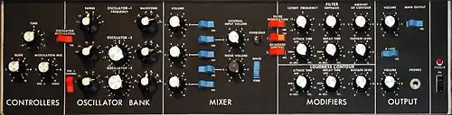 Le Minimoog dispose de quatre sources sonores : trois oscillateurs (VCO) et un générateur de bruit. Le troisième oscillateur peut être commuté en LFO (oscillateur basse fréquence) et utilisé pour moduler les deux autres oscillateurs ou le filtre. Les ondes sonores mélangées via les contrôles de la section mixer passent ensuite par le fameux « filtre Moog » — un VCF passe-bas résonnant à quatre pôles, 24 dB/oct — et un amplificateur (VCA), qui tous deux possèdent leur propre générateur d'enveloppe.