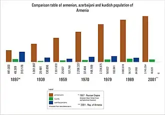 De plus, depuis l'indépendance, plusieurs autres groupes ethniques ont émigré, notamment les Russes (qui sont passés de 51 555 personnes en 1989 à 14 660 en 2001[1]), les Ukrainiens (8 341 en 1989[3] à 1 633 en 2001[1]), Grecs (4 650 en 1989[3] à 1 176 en 2001[1]) et Biélorusses (1 061 en 1989[3] à 160 en 2001[4]). Le nombre de Kurdes, d'Armeno-Tats et d'Assyriens est resté constant pour la plupart (bien qu'environ 2 000 Assyriens aient quitté l'Arménie entre 1989[3] et 2001[1]). Les Géorgiens ont également été historiquement comptés parmi les plus grands groupes ethniques de l'Arménie moderne, bien qu'il soit probable que leur nombre ait considérablement diminué depuis le recensement soviétique de 1989, alors qu'ils comptaient 1 364 personnes[3].