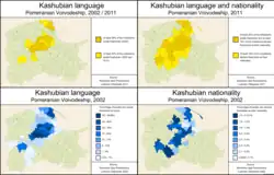 Lors du recensement de 2002, 5 100 personnes ont déclaré leur appartenance ethnique Cachoube ; 52 665 ont déclaré le cachoube comme langue maternelle. Dans dix communes, plus de 20 % de la population parlait cachoube : Przodkowo (49 %), Sulęczyno (48,6 %), Stężyca (43,2 %), Sierakowice ( 39,9 %), Linia (35,5 %), Chmielno (34,8 %), Puck (30,9 %), Somonino (30,8 %), Szemud (26,3 %) et Parchowo (22,6 %)[16]. Lors du recensement de 2011, le nombre de personnes citant l'ethnie cachoube comme première ethnie est passé à 17 000 ; 229 000 ont déclaré être Cachoubes comme première ou deuxième ethnie[19].