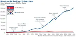 Initiée par le régime de Park Chung-hee dans les années 1960 au cours des Troisième et Quatrième Républiques, cette croissance se fonde sur deux piliers : le renforcement de grandes entreprises ainsi que la volonté d'exporter, la culture coréenne — valorisant le travail acharné et la discipline — apportant énormément à cette politique. Depuis, la Corée du Sud est considérée comme un modèle économique pour d'autres pays en développement[7],[8] et a adhéré au G20 en . La fin des années 1990 freine néanmoins cet élan avec les conséquences de la crise économique asiatique, le pays étant par ailleurs confronté à divers problèmes comme la stagnation des salaires, l'endettement des classes moyennes ou le manque de développement du secteur des services[9],[10].