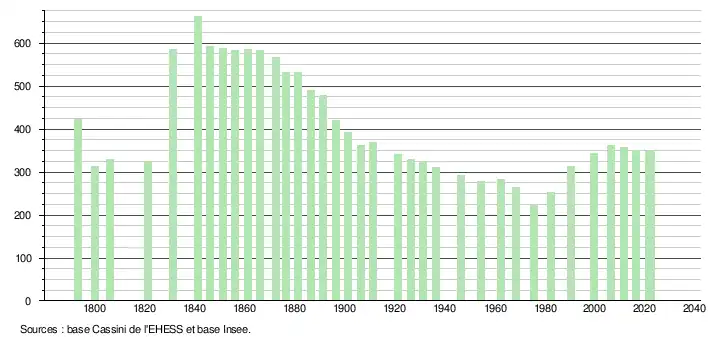 | L'évolution du nombre d'habitants est connue à travers les recensements de la population effectués dans la commune depuis 1793. Pour les communes de moins de 10 000 habitants, une enquête de recensement portant sur toute la population est réalisée tous les cinq ans, les populations de référence des années intermédiaires étant quant à elles estimées par interpolation ou extrapolation[22]. Pour la commune, le premier recensement exhaustif entrant dans le cadre du nouveau dispositif a été réalisé en 2006[23]. En 2022, la commune comptait 351 habitants[Note 2], en évolution de +0,29 % par rapport à 2016 (Gers : +1,04 %, France hors Mayotte : +2,11 %). |