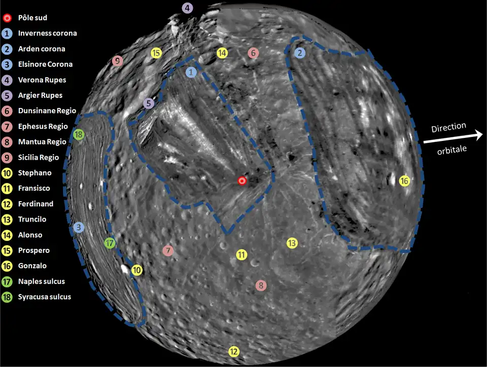 Dans le même esprit, les noms des formations géologiques remarquables de Miranda proviennent des lieux où se déroulent les principales intrigues de l’œuvre de Shakespeare[2].