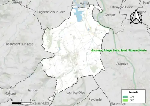 Le réseau Natura 2000 est un réseau écologique européen de sites naturels d'intérêt écologique élaboré à partir des directives habitats et oiseaux, constitué de zones spéciales de conservation (ZSC) et de zones de protection spéciale (ZPS)[Note 2]. Un site Natura 2000 a été défini sur la commune au titre de la directive habitats : « Garonne, Ariège, Hers, Salat, Pique et Neste »[21], d'une superficie de 9 581 ha, un réseau hydrographique pour les poissons migrateurs (zones de frayères actives et potentielles importantes pour le Saumon en particulier qui fait l'objet d'alevinages réguliers et dont des adultes atteignent déjà Foix sur l'Ariège[22].