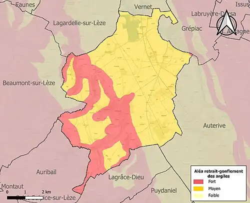 La commune est vulnérable au risque de mouvements de terrains constitué principalement du retrait-gonflement des sols argileux[31]. Cet aléa est susceptible d'engendrer des dommages importants aux bâtiments en cas d’alternance de périodes de sécheresse et de pluie. La totalité de la commune est en aléa moyen ou fort (88,8 % au niveau départemental et 48,5 % au niveau national). Sur les 919 bâtiments dénombrés sur la commune en 2019, 919 sont en aléa moyen ou fort, soit 100 %, à comparer aux 98 % au niveau départemental et 54 % au niveau national. Une cartographie de l'exposition du territoire national au retrait gonflement des sols argileux est disponible sur le site du BRGM[32],[Carte 3].