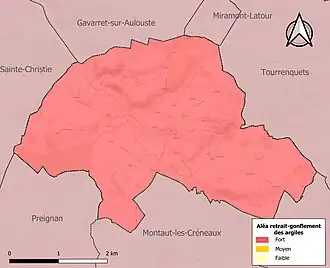 Le retrait-gonflement des sols argileux est susceptible d'engendrer des dommages importants aux bâtiments en cas d’alternance de périodes de sécheresse et de pluie. La totalité de la commune est en aléa moyen ou fort (94,5 % au niveau départemental et 48,5 % au niveau national). Sur les 123 bâtiments dénombrés sur la commune en 2019, 123 sont en aléa moyen ou fort, soit 100 %, à comparer aux 93 % au niveau départemental et 54 % au niveau national. Une cartographie de l'exposition du territoire national au retrait gonflement des sols argileux est disponible sur le site du BRGM[18],[Carte 3].