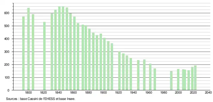 L'évolution du nombre d'habitants est connue à travers les recensements de la population effectués dans la commune depuis 1793. Pour les communes de moins de 10 000 habitants, une enquête de recensement portant sur toute la population est réalisée tous les cinq ans, les populations de référence des années intermédiaires étant quant à elles estimées par interpolation ou extrapolation[28]. Pour la commune, le premier recensement exhaustif entrant dans le cadre du nouveau dispositif a été réalisé en 2008[29].