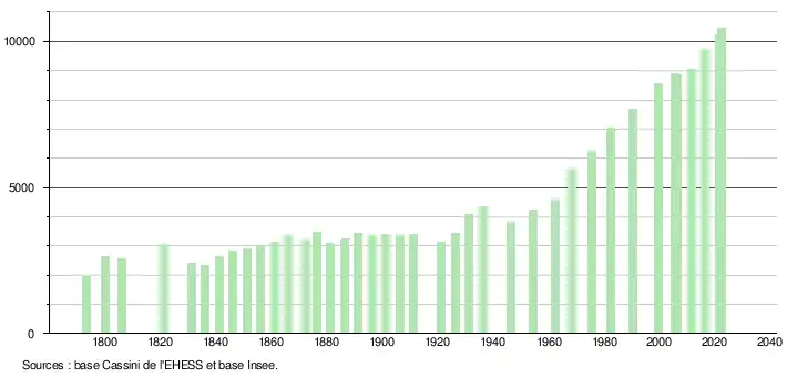 - ↑ Par convention dans Wikipédia, le principe a été retenu de n’afficher dans le tableau des recensements et le graphique, pour les populations de référence postérieures à 1999, que les populations correspondant à une enquête exhaustive de recensement pour les communes de moins de 10 000 habitants, et que les populations des années 2006, 2011, 2016, etc. pour les communes de plus de 10 000 habitants, ainsi que la dernière population de référence publiée par l’Insee pour l'ensemble des communes.