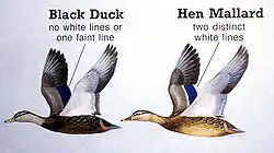 - Sarcelle d'hiver: présence d'un miroir vert (côté interne) et noir (côté externe) sur l'aile, encadré par des bandes blanches (devenant jaunâtres vers l'intérieur).