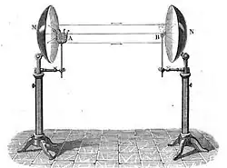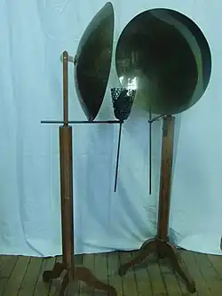 On appelle aujourd'hui miroirs ardents un dispositif expérimental utilisé notamment dans les cabinets scientifiques des XVIIe et XVIIIe siècles. Il s'agit de deux miroirs métalliques concaves (paraboliques) aux foyers desquels on peut placer des corbeilles, l'une contenant des charbons ardents, l'autre (le plus souvent) de l'amadou.