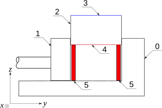 Si la face à usiner [3] est opposée à la surface de référence [4], il faut assurer un appui plan sur le fond. Mais si l'on se contente de poser la pièce sur le fond, on a alors un autre appui plan sur le mors fixe, on bloque donc deux fois la rotation autour de x. On place donc la pièce sur des cales hautes [5] pour que la surface serrée par les mors soit la plus petite possible, afin que la liaison s'approche d'une liaison linéaire rectiligne ; mais cette surface serrée doit être suffisante pour assurer un bon maintien de la pièce.