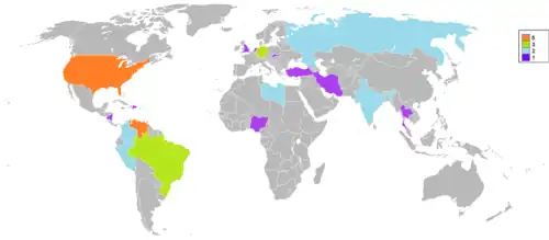 | Amérique | 27 | États-Unis et Venezuela (5), Porto Rico et Brésil (3), Colombie, Curaçao et Pérou (2), Argentine, Îles Vierges des États-Unis, Jamaïque, Nicaragua et République dominicaine (1) |