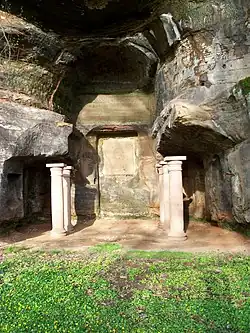 La grotte initiale a été agrandie pour recevoir trois nefs ; celle centrale mesure 3,90 m de haut avec un plafond voûté et les deux autres sont moins hautes et ont un plafond plat. Le sol de la nef centrale est creusée de 0,30 m pour permettre que les côtés fassent office de banc pour les adeptes.