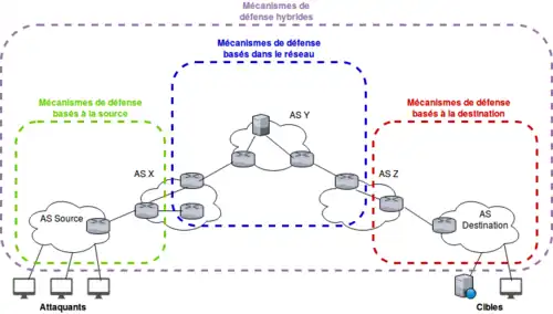 La défense Hybride vise à combiner les points forts de chaque solution en déployant des mécanismes de défense à plusieurs endroits tels que la source, la destination ou le réseau intermédiaire et en les faisant interagir. Un mécanisme hybride consiste généralement en la combinaison d'un filtrage à hauteur de la source et une limitation de la bande passante pour le trafic attaquant à hauteur de la cible[10].