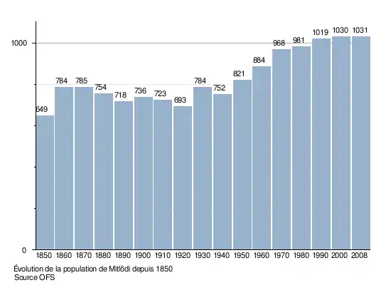 Selon l'Office fédéral de la statistique, Mitlödi possède 1 000 habitants fin 2023[2]. Sa densité de population atteint 161 hab./km2.