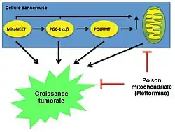 MitoNEET, PGC-1 (notamment les isoformes α et β) et POLRMT induisent tous la biogenèse mitochondriale et promeuvent efficacement la croissance tumorale, lorsqu'elle est exprimée dans les cellules cancéreuses. Ainsi, l'utilisation thérapeutique des inhibiteurs mitochondriaux ou « poisons » (tels que la metformine) va inhiber la croissance tumorale. Surtout, de nombreuses études cliniques ont montré que la metformine (un inhibiteur du complexe I mitochondrial) empêche l'apparition de presque tous les types de cancers humains chez les patients diabétiques.