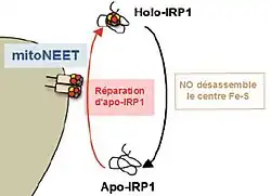 L’aconitase cytosolique (ou Holo-IRP1) perd son centre Fe-S à la suite d'un stress NO qui devient apo-IRP1. MitoNEET qui est localisée sur la membrane externe mitochondriale transfère son centre Fe-S à l’apo-IRP1 qui est réactivé en aconitase cytosolique[1],[2],[3],[4],[5],[6],[7],[8],[9],[10],[11],[12],[13],[14].