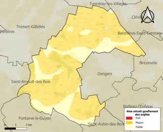 Le retrait-gonflement des sols argileux est susceptible d'engendrer des dommages importants aux bâtiments en cas d’alternance de périodes de sécheresse et de pluie. 78,2 % de la superficie communale est en aléa moyen ou fort (52,8 % au niveau départemental et 48,5 % au niveau national). Sur les 339 bâtiments dénombrés sur la commune en 2019, 261 sont en aléa moyen ou fort, soit 77 %, à comparer aux 70 % au niveau départemental et 54 % au niveau national. Une cartographie de l'exposition du territoire national au retrait gonflement des sols argileux est disponible sur le site du BRGM[15],[Carte 1].