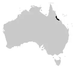 Cette espèce est endémique du Nord-Est du Queensland en Australie. Elle se rencontre entre 100 et 1 500 m d'altitude[1],[2].