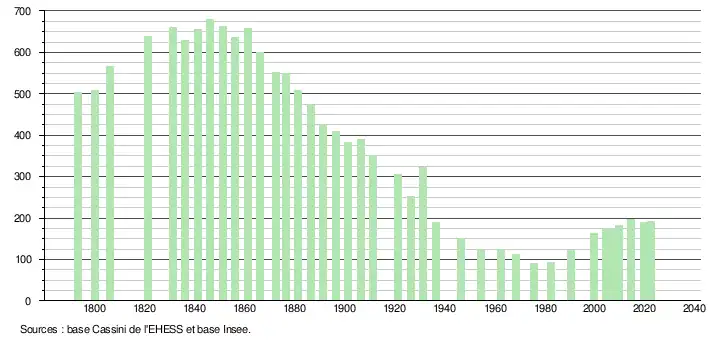 L'évolution du nombre d'habitants est connue à travers les recensements de la population effectués dans la commune depuis 1793. Pour les communes de moins de 10 000 habitants, une enquête de recensement portant sur toute la population est réalisée tous les cinq ans, les populations de référence des années intermédiaires étant quant à elles estimées par interpolation ou extrapolation[18]. Pour la commune, le premier recensement exhaustif entrant dans le cadre du nouveau dispositif a été réalisé en 2004[19].