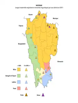 Les principales langues parlées lors du recensement de 2001 sont le mizo (650 605), le chakma (80 389), le lakher (34 731), le pawi (24 900), le kuki (21 040), le tripuri (17 580), le hmar (14 240), le paite (14 367), etc.