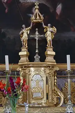 Coffret où est conservé le Saint Sacrement à côté duquel brille une lumière rouge. Le tabernacle a fait son apparition au XVIe siècle, succédant aux suspensions eucharistiques (colombes et pyxides). Il est placé au milieu de l'autel où il est scellé. Sa présence est obligatoire dans les cathédrales et les églises paroissiales. Il doit être entièrement fermé de tous côtés, avec une porte munie d'une clef. Depuis la promulgation de l'Ordo missae de 1969, le tabernacle peut être de nouveau détaché de l'autel pour être encastré dans le mur du chœur.