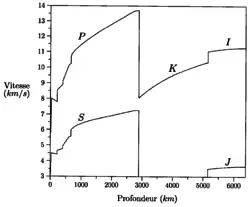 De l'extérieur vers l'intérieur, les géophysiciens recensent ainsi dans le cadre du modèle PREM à symétrie sphérique, la croûte terrestre, le manteau, le noyau externe et le noyau interne. Dans le manteau supérieur, une LVZ (Low Velocity Zone : zone de faible vitesse) permet de définir l'asthénosphère et la lithosphère. De plus, la tomographie sismique montre une réalité plus complexe avec l'existence d'hétérogénéités latérales liées aux plaques tectoniques en subduction, aux courants de convections et aux différences de température qu'ils engendrent[2].