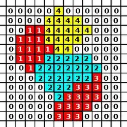 Le CPM est composé d'une grille rectangulaire où chaque pixel peut appartenir soit à une cellule, soit au milieu. Une cellule se compose donc d'un ensemble de pixels qui partagent le même identifiant (id).