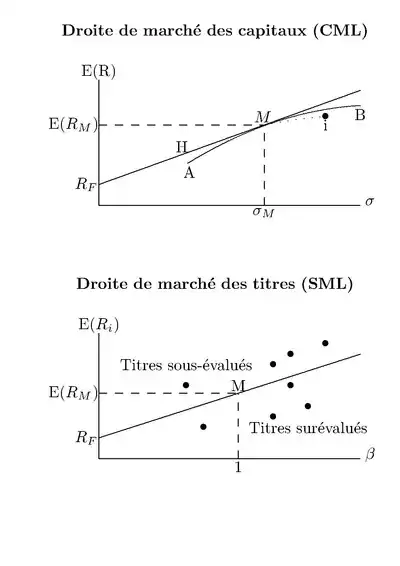 Soit le rendement du titre sans risque (par exemple, les bons du trésor des États-Unis coupon zéro). La droite de marché des capitaux part de et est tangente à la courbe A-B. Un investisseur peut choisir tout portefeuille sur la droite entre et M. Tous les investisseurs doivent posséder le portefeuille de marché M dans des proportions plus ou moins grandes. Par exemple, le portefeuille H comprend en part égale le titre sans risque et le portefeuille M.