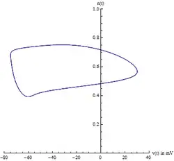 Comme il existe quatre variables d'état, il peut être difficile de visualiser le chemin dans l'espace des phases. Habituellement, deux variables sont choisies, la tension et la variable de contrôle du potassium , permettant de visualiser le cycle limite. Cependant, il faut être prudent car il s'agit d'une méthode ad hoc de visualisation du système à 4 dimensions. Cela ne prouve pas l'existence du cycle limite.