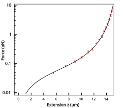 On voit que la molécule présente un comportement élastique non linéaire. On s'est servi d'équipements de laboratoires variés, de la microscopie à force atomique (AFM) aux pinces optiques, pour tenter de caractériser l'élasticité des tissus biologiques. La formule d'interpolation suivante[11] l'approche à 15% près :