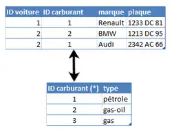 Dans deux tables A et B de relation 1:N, un uplet de la table A peut se rapporter à plusieurs uplets de la table B, et un uplet de la table B seulement à un uplet de la table A.