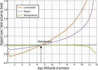 Les réactions nucléaires dans le cœur du Soleil modifient sa composition, en convertissant les noyaux d'hydrogène en noyaux d'hélium par la chaîne proton-proton et (dans une moindre mesure dans le Soleil que dans les étoiles plus massives) par le cycle CNO. Cela augmente le poids moléculaire moyen dans le cœur du Soleil, ce qui devrait conduire à une diminution de la pression. Ce n'est pas le cas, car le noyau se contracte. Selon le théorème du viriel, la moitié de l'énergie potentielle gravitationnelle libérée par cette contraction sert à augmenter la température du noyau, et l'autre moitié est rayonnée[réf. nécessaire]. Cette augmentation de la température accroît également la pression et rétablit l'équilibre hydrostatique. La luminosité du Soleil est accrue par l'augmentation de la température, ce qui augmente le taux des réactions nucléaires. Les couches externes se dilatent pour compenser l'augmentation des gradients de température et de pression, de sorte que le rayon augmente également[3].