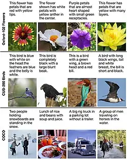 L'entraînement d'un modèle texte-image nécessite un ensemble de données associant des images à des légendes textuelles. Un ensemble de données couramment utilisé à cet effet est l'ensemble de données COCO. Publié par Microsoft en 2014, COCO se compose d'environ 123 000 images représentant une diversité d'objets avec cinq légendes par image, générées par des annotateurs humains. À l'origine, l'objectif principal de COCO porte sur la reconnaissance d'objets et de scènes dans les images. Oxford-120 Flowers et CUB-200 Birds sont des ensembles de données plus restreints d'environ 10 000 images chacun, se concentrant respectivement sur les fleurs et les oiseaux. Il apparaît moins difficile d'entraîner un modèle texte-image de haute qualité avec ces ensembles de données en raison de leur champ thématique étroit[6].
