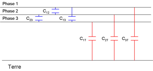 Dans un système triphasé, il y a des capacités entre les lignes et la terre, mais également entre lignes. L'objectif est de synthétiser le tout dans une seule capacité "moyenne" Cb égale pour les trois lignes :