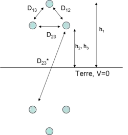 Afin de modéliser le potentiel nul de la terre, on utilise le principe des miroirs. C'est-à-dire qu'on modélise des conducteurs fictifs placés de manière symétrique à la terre par rapport aux conducteurs réels et chargés de manière opposée. La terre a alors un potentiel nul.