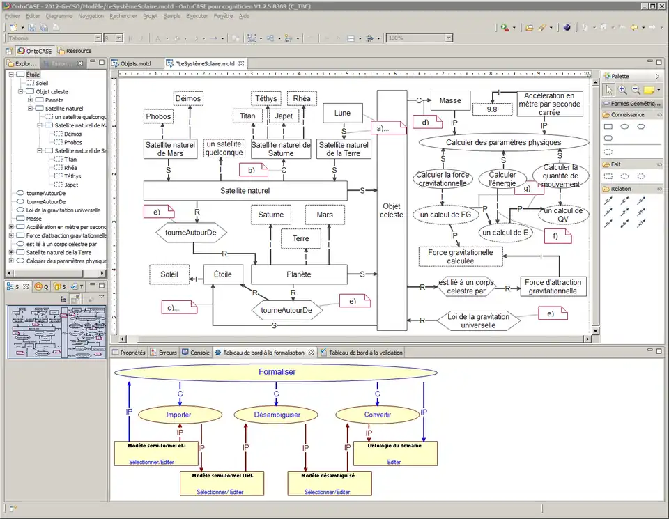 La figure 10 présente l'interface utilisateur de l'application OntoCASE. Eli, le module d'édition de modèle MOT est une application Eclipse (projet). Au centre de la moitié supérieure de la figure 10, se trouve le schéma du modèle semi-formel, alors qu'à gauche, la vue en graphe de composites en présente la taxonomie. La moitié inférieure droite présente un tableau de bord (sous forme d’un modèle procédural) permettant au cogniticien de lancer les processus nécessaires à la formalisation (importer, désambiguïser et convertir) et d'éditer au besoin chaque modèle après le déclenchement du processus. Sont aussi accessibles : une vue permettant le contrôle de la validation, une console de commandes exécutées, un volet des propriétés des objets ainsi qu’un calepin des messages d'erreurs. Dans la section inférieure gauche, l'utilisateur a accès à des utilitaires tels qu'un calepin de tâches à faire, une structure Subversion (logiciel) pour le contrôle de version des ontologies, une vue de manipulation du serveur Web ainsi qu'une vue de structure facilitant la navigation dans de grands modèles.