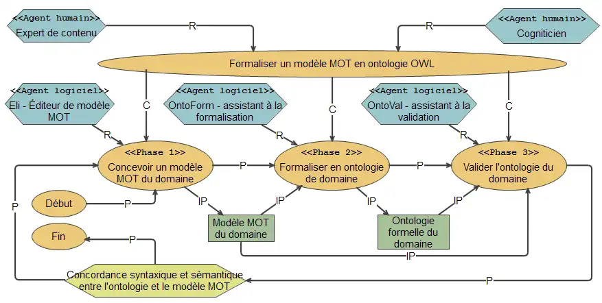 - Le deuxième acteur, le cogniticien qui est un ingénieur de la connaissance, a un rôle de support à la formalisation auprès de l'expert de contenu. L'ingénieur guide l'expert pendant la conception du modèle MOT; il réalise l'exécution de la méthode de formalisation, puis il travaille en collaboration avec l'expert pour la validation de l'ontologie.