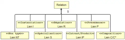 Le symbole concret de type relation est un lien typé. Dans sa définition originale MOT possède six liens typés {C, I, P, S, IP, R} (voir la figure 4) et un lien non typé. Chaque type de lien possède une sémantique propre.