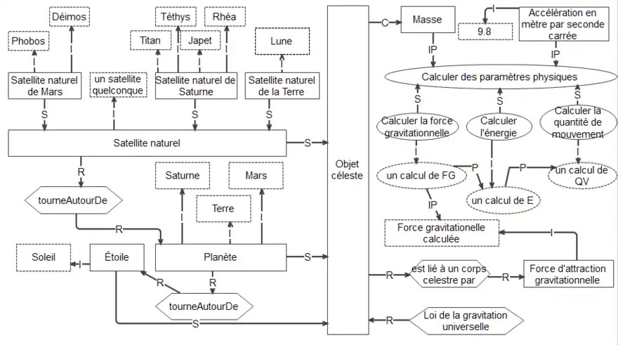 Voici en quelques lignes la pensée qui aurait pu conduire à une telle modélisation. Le corps céleste est régi par la loi de la gravitation universelle. Il a pour attribut une masse et est lié par la force d'attraction gravitationnelle. Cette force est calculée à partir de la masse et de l'accélération gravitationnelle qui est de 9.8 m/s2. D'autres paramètres physiques peuvent être calculés tel que l'énergie et la quantité de mouvement. Les étoiles, les planètes et les satellites naturels sont des corps célestes. Les planètes tournent autour des étoiles et les satellites naturels tournent autour des planètes. Sature, Mars et la Terre sont des planètes alors que Déimos, Phobos sont des satellites de Mars. Titan, Téthys, Japet et Rhéa sont des satellites naturels de Saturne. Finalement, la Lune est un satellite naturel de la Terre.