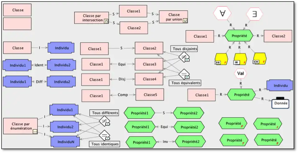 - - Modèle ontologique OWL-DL : Les éléments OWL sont représentés par des objets et des relations graphiques spécifiques. Des étiquettes spécifie certains axiomes de l'ontologie. Le modèle est validé lors de son exportation dans le format standard OWL-DL.