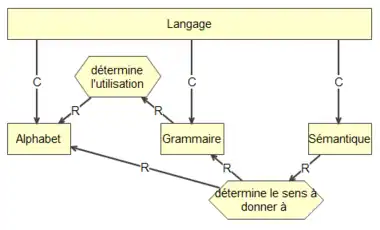 L’alphabet est constitué de symboles, d’icônes ou de la représentation de base du langage (ce que l'on appel parfois les primitives du langage). Par exemple, en langue française, l’alphabet se compose de caractères regroupés en voyelles et en consonnes. La grammaire, quant à elle, sert à définir les règles d’utilisation des symboles. L’application des règles est indépendante du sens que représentent les symboles. La sémantique est la définition du sens qui est donné aux symboles. Par exemple, dans la figure 1, deux symboles sont utilisés soit le rectangle représentant un concept et la flèche traversée d’un « C » qui indique un lien de composition. La règle de grammaire utilisée ici s’énonce comme suit : « un lien de composition qui a comme origine un concept relie à sa destination un autre concept ». La sémantique associée à cette règle est : un concept A est composé d’un concept B. Par exemple, dans la figure 1 on peut lire : « le concept langage se compose des concepts : Alphabet, Grammaire et Sémantique ».