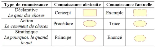Le symbole concret de type connaissance est une connaissance typée. Dans sa définition originale MOT possède six connaissances typées {concept, procédure, principe, exemple, trace et énoncé} (voir le tableau 1 et le tableau 2), Chaque connaissance est associée à un niveau d'abstraction (abstrait ou factuel) ainsi qu'à un type (déclaratif, procédural ou prescriptif.