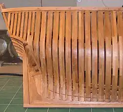 La charpente terminée, la forme du vaisseau apparaît, mais il est hors de question de la manipuler hors de son chantier, l’ensemble, étant solidarisé par la seule quille, se briserait immédiatement lors d’une manipulation à mains nues. Des renforts fixés sur l'extrémité haute des couples, prévus plus longs que nécessaire, permettent au besoin de renforcer l'ensemble.