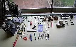 Il est souvent dit que les deux principaux outils du modéliste d’arsenal sont la patience et la persévérance. On pourrait y ajouter une dose d’huile de coude. Celui-ci s’aide ensuite de quelques outils tout simples, des ciseaux à bois, souvent fabriqués par le modéliste lui-même (car les outils qu’on se fabrique soi-même sont la plupart du temps les meilleurs et les plus adaptés), quelques limes fines, du papier de verre, une petite scie à chantourner manuelle. La modernité aidant, une mini perceuse électrique et ses fraises variées, mais puissante (il faut éviter les outils en 12 V qui chauffent trop vite) est un complément vite indispensable.
