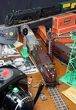 Viennent ensuite, vers 1890-1900[L 9], ce qu'on appelle les trains jouets, roulant sur rails. Ces rails en coupons, d'abord à ornières[19] puis avec de véritables éléments de voie (parfois appelés improprement « rails ») sont assemblables à l'envi. Ces éléments de voie permettent les premiers ovales de voie, agrémentés pour certains d'appareils de voie (aiguillages, croisements, etc.).