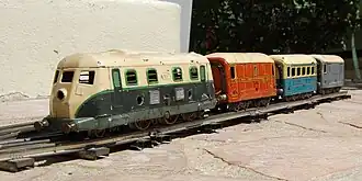 Train jouet en tôle, 1949. La locomotive reproduite est simplifiée à l'extrême : les essieux moteur, sûrement plus nombreux, sont réduits au minimum. Le bloc moteur utilisé est sans doute le même pour tous les engins moteurs du fabricant.